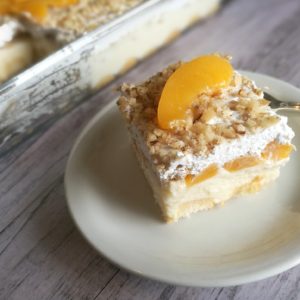 Στραγγίζουμε τα ροδάκινα και κρατάμε το σιρόπι. Κόβουμε τα κομμάτια του ροδάκινου σε φέτες.