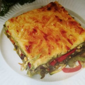 Στρώνετε τα μισά λαζάνια στον πάτο ενός βουτυρωμένου πυρέξ και απλώνετε τη μισή ποσότητα από τα λαχανικά. Σκεπάζετε με τα υπόλοιπα λαζάνια. Ρίχνετε από πάνω τη μπεσαμέλ, πασπαλίζετε με τ υπόλοιπο τυρί και ψήνετε τα λαζάνια σε προθερμασμένο φούρνο στους 200°C για 40 λεπτά περίπου. Σερβίρετε αμέσως.